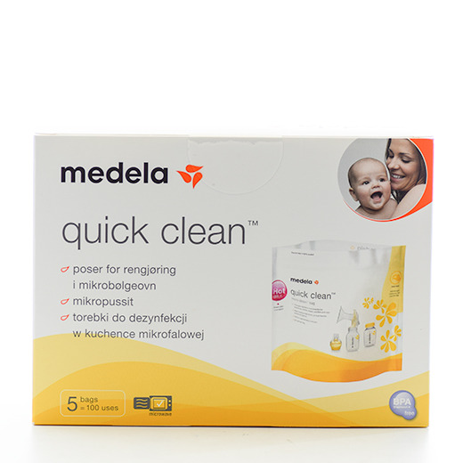 Med Medelas Quick Clean-rengøringsposer til mikroovn kan man desinficere ammetilbehør, – som for eksempel flasker og slanger på 3 minutter. Det gør metoden hurtigere og enklere end kogning.