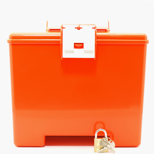 Sygeplejekasse med låg fremstillet i orange, slagfast ABS-plast.