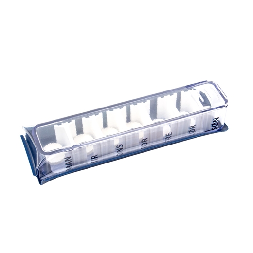 Medidos 7-dags doseringsæske har flytbare skillevægge, så rummene kan justeres efter antallet af piller.