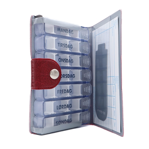 Den bordeaux farvede kunstlædermappe med velcro lukning (10,5 x 15,5 x 2,5 cm) indeholder 7 æsker, 1 for hver ugedag.