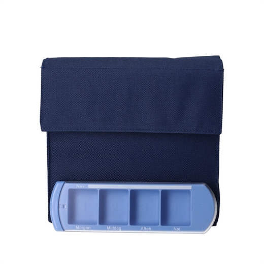 Medinizer doseringsæskerne er placeret i en blå nylontaske med velcrolukning.