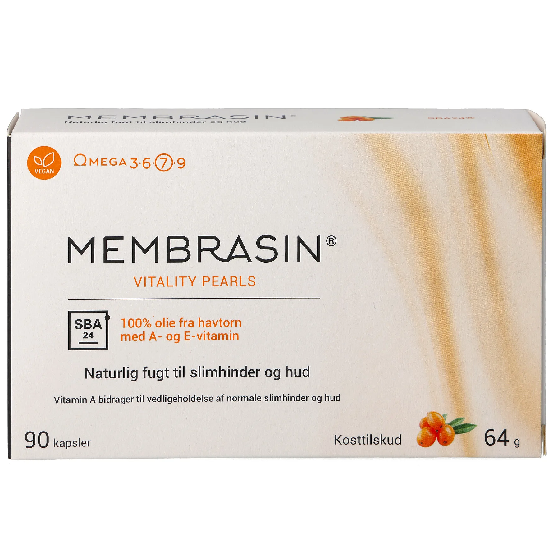 Membrasin Vitality Pearls er et kosttilskud, der indeholder havtornbærolie, vitamin A og vitamin E.