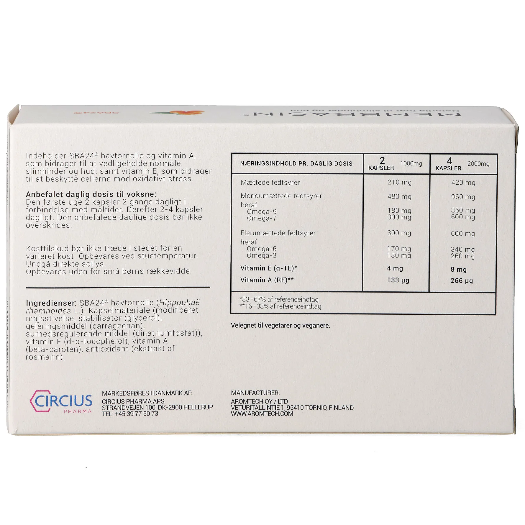 SBA24 Havtornbærolie (Hippophaë rhamnoides L.), Modificeret majsstivelse, Glycerol, Carrageenan, Dinatriumfosfat, DL-alfa-tocopherol (vitamin E), Betacaroten, Rosmarinekstrakt.