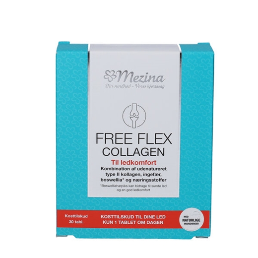 Mezina Free Flex Collagen er et kosttilskud, der indeholder type II kollagen, ingefær, Boswellia serrata og næringsstoffer.