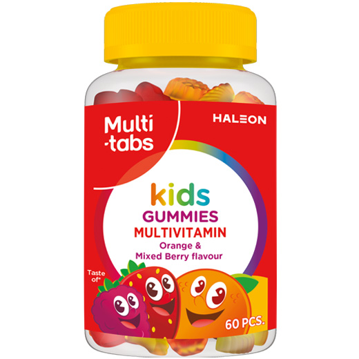 Multi-tabs Kids Multivitamin er en tygbar multivitamin gummy med smag af appelsin og blandede bær til børn +4 år. Indeholder de vigtigste vitaminer for børn bl.a. D-vitamin, som er nødvendigt for normal vækst og knogleudvikling hos børn.