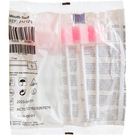 Tør Mundrensepind 11 cm m/svamp Pink anvendes til pleje af tænder, slimhinde og tunge. Skal vædes med eksempelvis danskvand inden plejen udføres. Kan endvidere benyttes til stimulering af mundhulen ved lammelse. Er til engangsbrug.