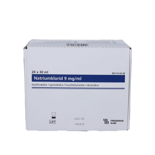 Natriumklorid isotonisk skyllevæske i en 30 ml klar, gennemsigtig plastikampul.