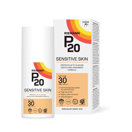Riemann P20 Sensitive Skin SPF30 er en hurtigt absorberende solcreme som er dermatologisk testet til sensitiv hud, parfumefri, AllergyCertified og vegansk. Solcremen indeholder Riemanns unikke Triple Protection Technology, der giver op til 10 timers solbeskyttelse, høj vandfasthed og det dobbelte af EU’s krav til UVA-beskyttelse. Solcremens formulering sikrer at den er let at påføre, hurtigt-absorberende og sikrer en ensartet og jævn fordeling af solbeskyttelsen.