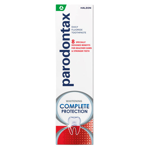 Tandpasta til daglig brug mod tandkødsproblemer. Parodontax Complete Protection Whitening er en daglig fluoridtandpasta, der hjælper med at stoppe og forebygge blødende tandkød. Den giver 8 fordele for sundere tandkød, og fjerner skånsomt pletter for hvidere tænder ved brug to gange dagligt. Efter 2 ugers brug kan de fleste lide den unikke smag.