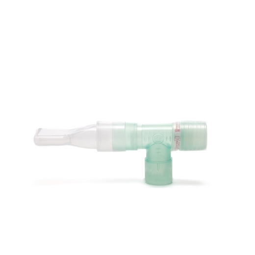 PEP-Fløjten består af et grønt T-stykke og et transparent mundstykke. Mundstykket monteres på T-stykket.