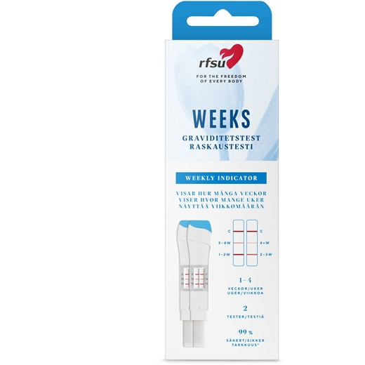 Graviditetstest med ugeindikator, der viser hvor mange uger der er gået. Test tidligt – op til 4 dage før forventet menstruation. Nem at bruge med bred spids – urinér direkte på testen. Klart resultat inden for 1–5 minutter. Testets følsomhed er 25 mlU/ml. Indeholder 2 teststav.