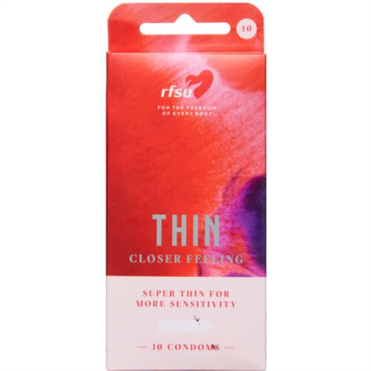 RFSU Tynd – Kondomet til dig, der ønsker en tættere oplevelse. RFSU Thin er et ekstra tyndt og sikkert kondom med indvendt top for den bedste pasform og øget fornemmelse. Kondomet har en beholder i toppen, er ufarvet og glat med ekstra glidecreme (silikone). Kondomer er det eneste præventionsmiddel, der beskytter mod både graviditet og seksuelt overførte sygdomme og er fuldstændig hormonfrit. Ingen prævention er 100 % sikker.