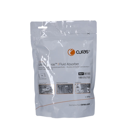 SAP Curas absorberende indlæg (Super Absorberende polymer) pakket i små poser (á 6 gram) til absorption af væsker og til lugtreduktion.