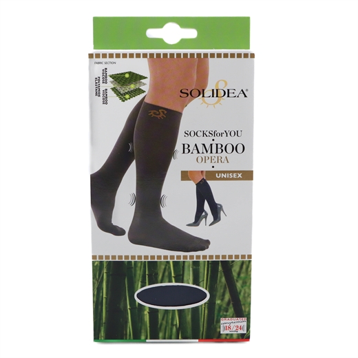 Solidea Bamboo Opera unisex knæstrømpe er med gradvis kompression 18/24 mmHg med værdifulde bambusfilament. Det medicinske udstyr er velegnet til at behandle og lette det venøseog lymfetilbageløb, og til forebyggelse af en eller flere forstyrrelser med blodcirkulationen (f.eks. Ødem, dyb venetrombose (DVT), åreknuder, lymfødem).