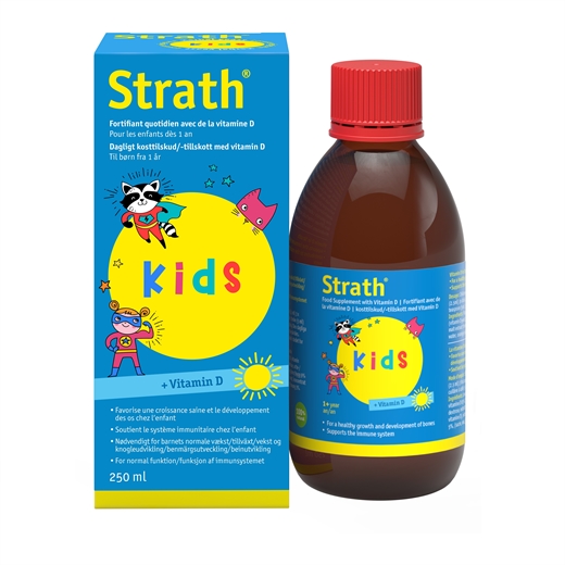 Strath Kids + Vitamin D er et flydende kosttilskud til børn.