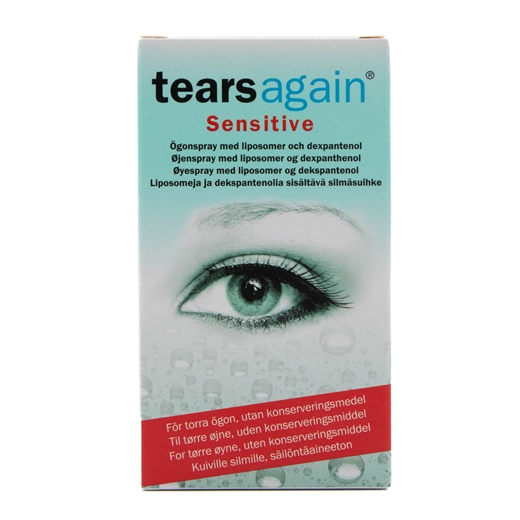Tearsagain Sensitive til alle med tørre øjne og øjne, der løber i vand. Tearsagain Sensitive reparerer det ødelagte lipidlag og kan anvendes med kontaktlinser og øjen-makeup. Tearsagain Sensitive er uden konserveringsmiddel. En nem og effektiv øjenspray, der kan anvendes uden spejl, og når man er på farten. Spray på et let åbent øje. Kan deles med andre og kan ikke overdoseres.