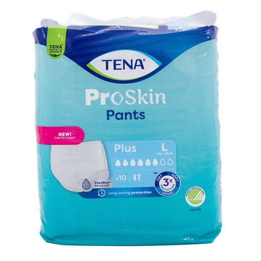 TENA Pants Plus Classic er bløde og behagelige buksebleer med et unisex design og fugtreducerende teknologi, der sikrer høj sugeevne, lækagesikkerhed og lugtkontrol. TENA ProSkin Pants er en bukseble, der sidder som almindelige underbukser, og er velegnet til mobile og delvist mobile personer.