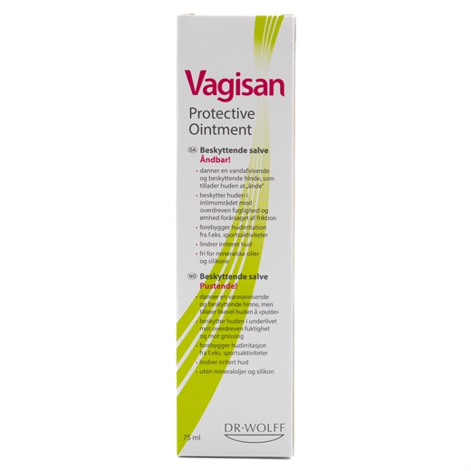 Vagisan Beskyttelsessalve danner en vandafvisende beskyttelsesfilm, som stadig tillader huden at “ånde”. Det betyder, at huden kan beskyttes mod hudirriterende påvirkninger og dermed mod at blive øm, uden at der opbygges fugt.