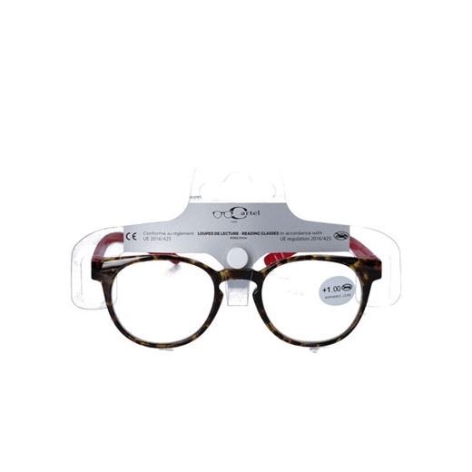 Brillen er i et tidløst skildpaddemønster med røde brillestænger.