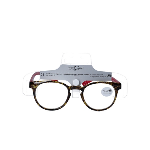 Brillen er i et tidløst skildpaddemønster med røde brillestænger.