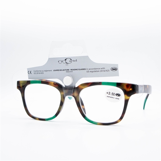 Brillen er udformet i et tidløst, kantet, mørkt og mat skildpaddemønster med grønne detaljer.