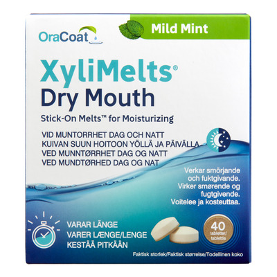 Xylimelts indeholder xylitol, som øger spytproduktionen og lindrer gener forbundet med mundtørhed.